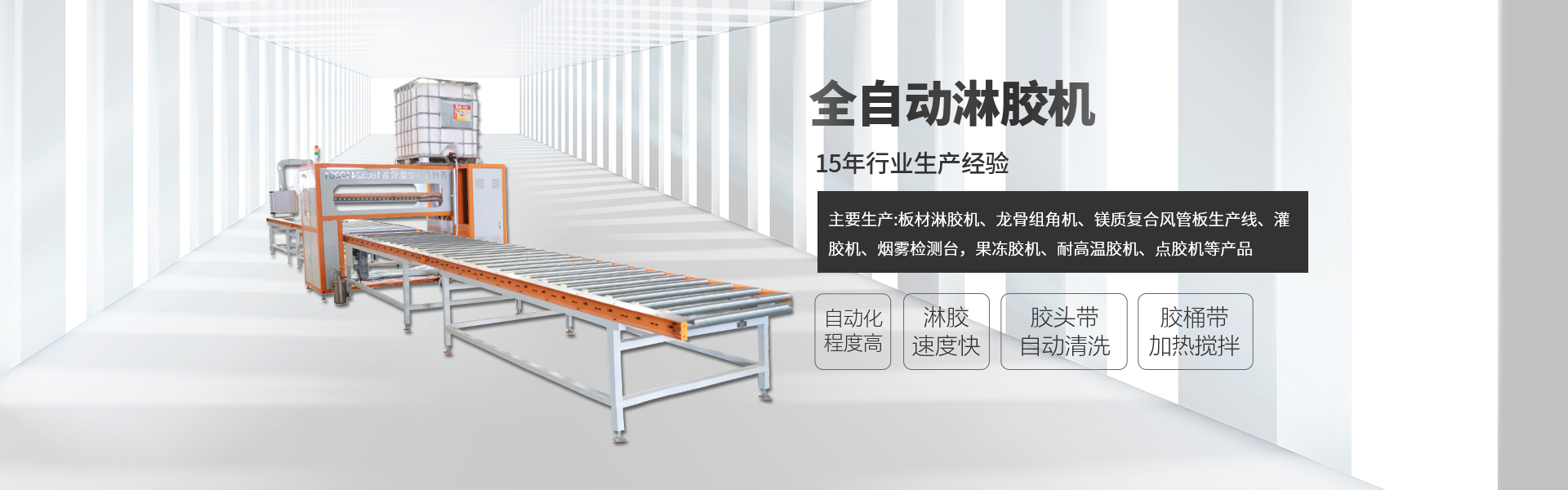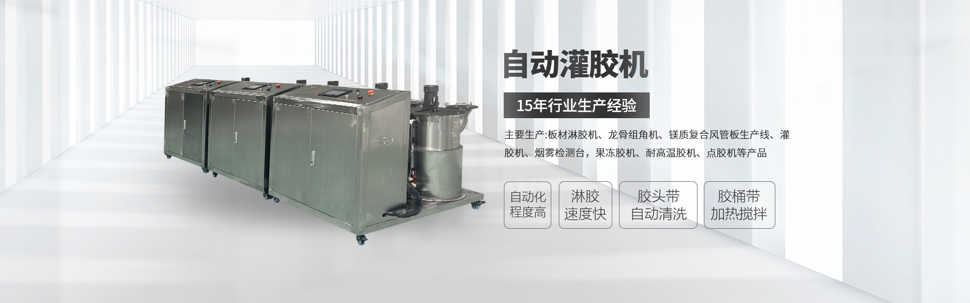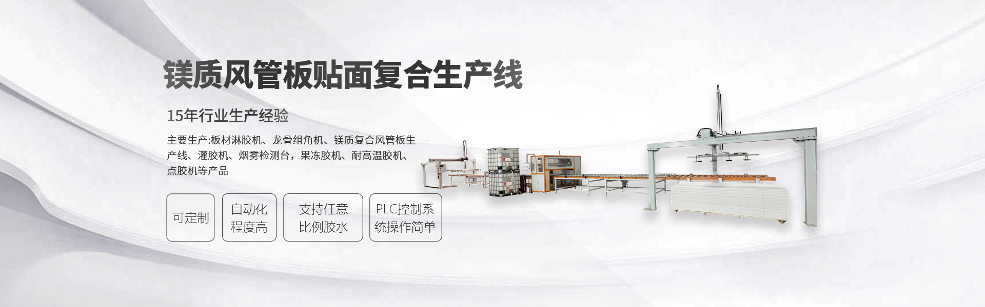 主要生产:板材淋胶机、龙骨组角机、风管板生产线、灌胶机、烟雾检测台,果冻胶机、耐高温胶机、点胶机等产品
